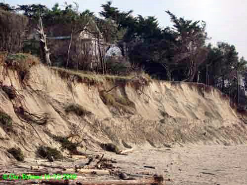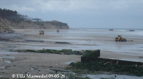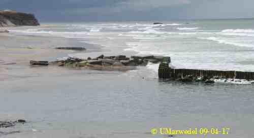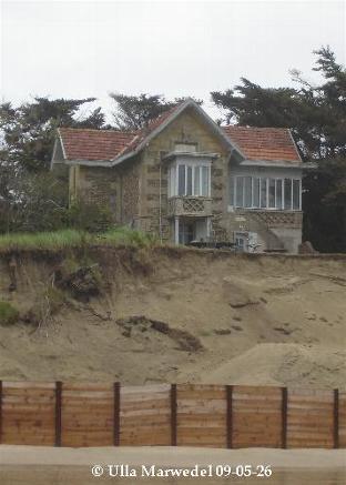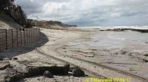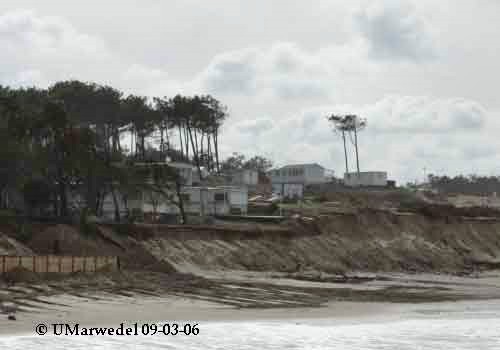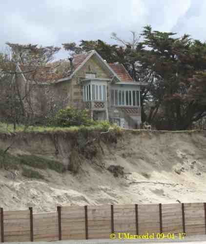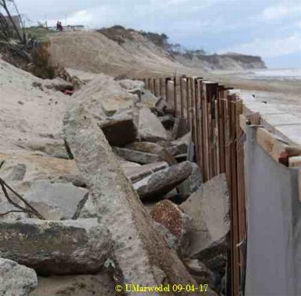 Das am meisten bedrohte Haus hat einen ersten Schutzwall am Fuß der Düne erhalten. Die Bohlenwand wird von massiven Eisenträgern gehalten. Hinter den Bohlen sind Betonbruchstücke und Sand aufgefüllt.