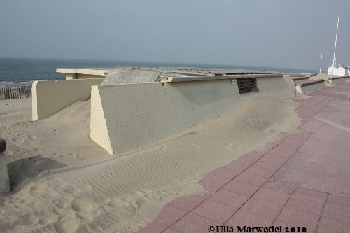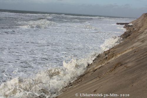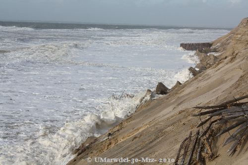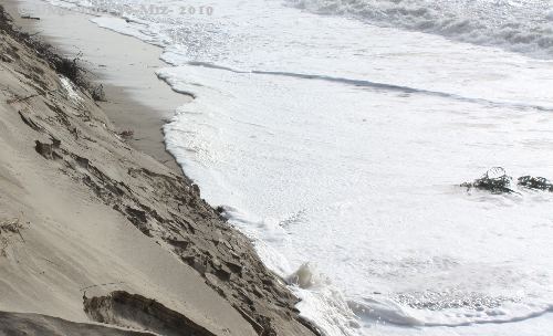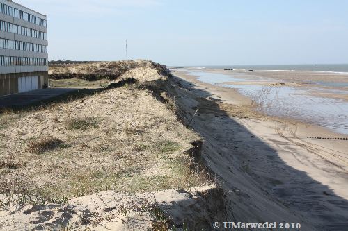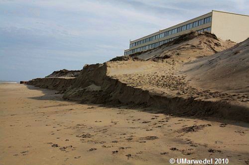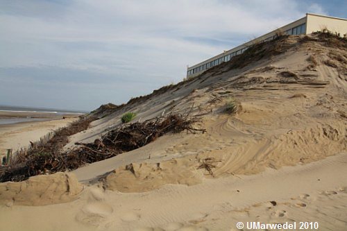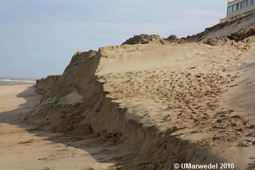 8. Oktober 2010. Nach einer starken Flut mit hohem Koeffizienten. Etwa die Hälfte des im späten Frühjahr am Dünenfuss aufgeschütteten Sandes ist weggeschwemmt worden. Auffällig die scharf geschnittene Kante.