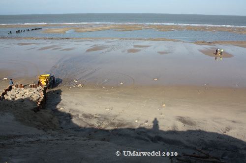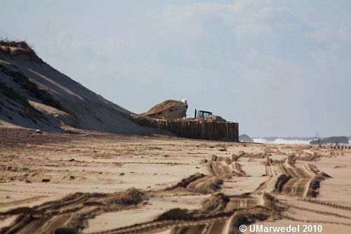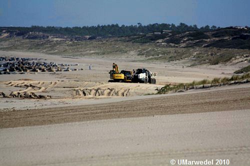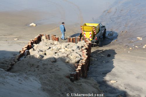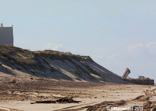 Blick von oben auf die Anschüttungen. Der nach den Frühjahrsstürmen aufgeschüttete Sand ist in den letzten Tagen noch weiter weggeschwemmt worden. (20. Okt. 2010)