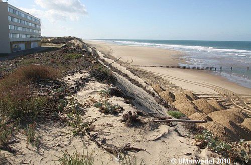 Der Fuss der Düne hinter dem Appartementhaus Le Signal, gesehen vom südlichen Strandbereich. Die rechts am Bildrand sichtbaren Zaunreste standen einst oben auf dem seit Xynthia verschwundenen Teil der Düne. Die kleinen spitzen Erhebungen am Fuss der Düne sind die Reste des am Vortag angeschütteten Sandes.
