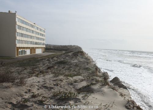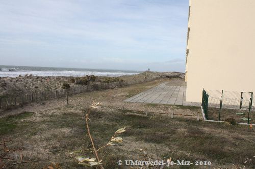Das Appartementhaus Le Signal in Soulac am 20. Dezember 2010. Es sind erhebliche Mengen Sand am Fuß der Düne angeschüttet worden, die aber nach einer einzigen hohen Flut weggeschwemmt sein können. Die Bedrohungssituation für das Haus ist jedenfalls nicht beseitigt.