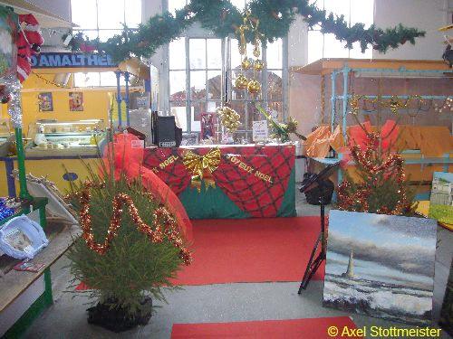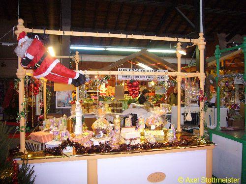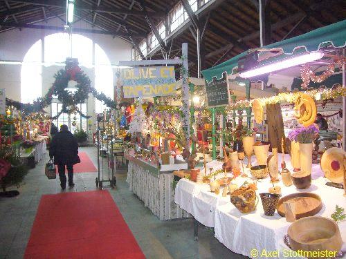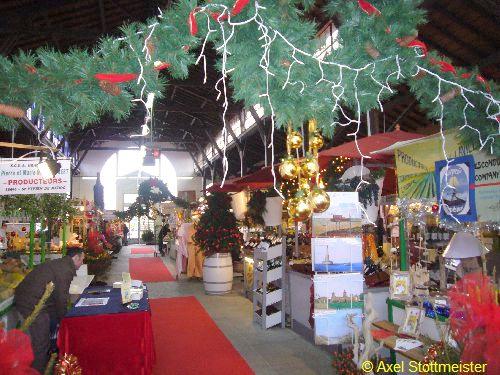Die Markthalle von Soulac hat vorweihnachtlichen Schmuck angelegt. Auch Stände, die zur Zeit nicht belegt sind, wurden dekoriert.