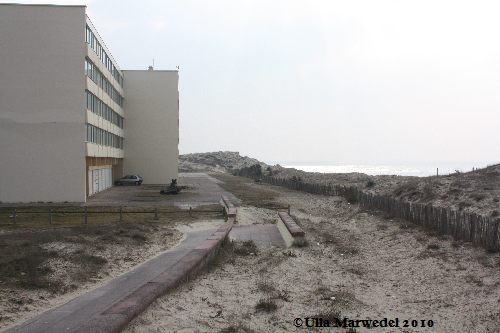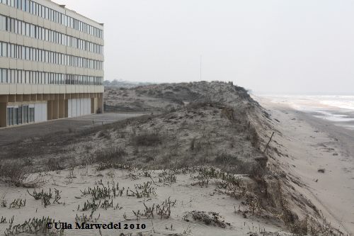 Links eine Ecke des Appartementhauses und die davor liegende Düne, die merklich weniger steil ist als im Frühjahr. (20. Okt. 2010)