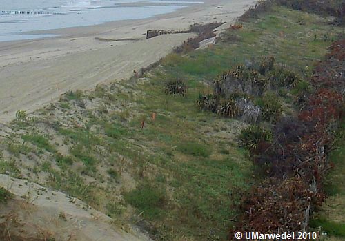 Standort wie beim vorigen Bild, Blickrichtung nach Süden. Auch hier wird der Fuss der Düne massiv attackiert.