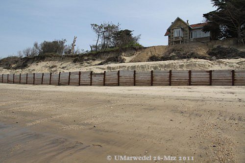 Man sieht, dass der hinter den Bohlen aufgeschüttete Sand von den Wellen erreicht und teilweise abgespült wurde.
