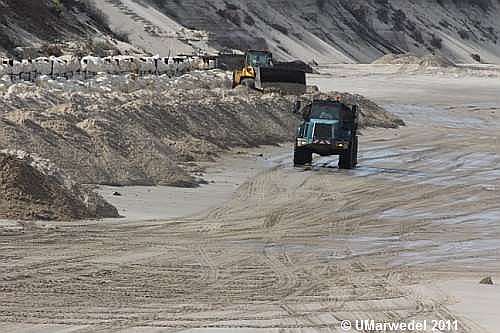 Vor dem Anschütten des Sandes ist unten an der Düne vor dem Campingplatz zum Schutz der Bohlenwand ein neuer Wall aus Felsbrocken angelegt worden.