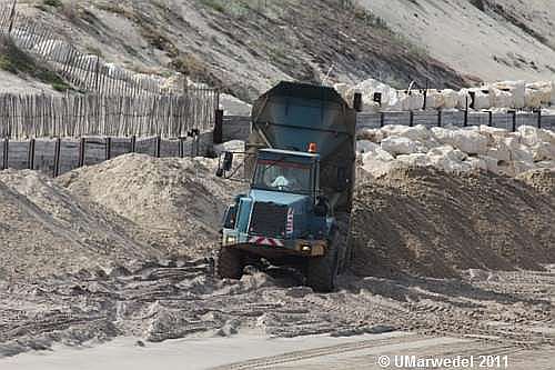 Fern an der Pointe de la Négade belädt ein Bagger wie am Fließband große Muldenkipper.