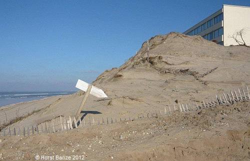 Am Fuß der Düne. Der helle Sand ist nach dem letzten Sturm aufgeschüttet worden. Ein wirklicher und dauerhafter Schutz für das Gebäude ist damit nicht hergestellt worden.