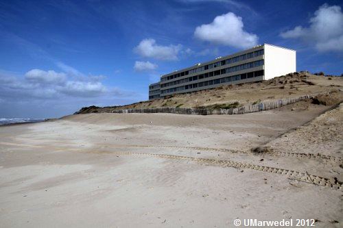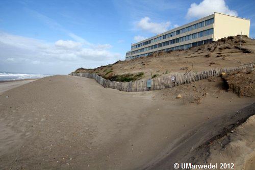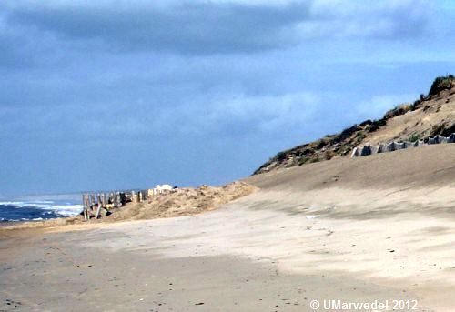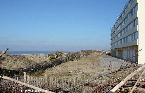 Die dem Ozean zugewandte Seite des Hauses. Es sieht so aus, als ob sich die Lage des Gebäudes nicht weiter verschlechtert hat. Allerdings muss man daran denken, dass zu dem Zeitpunkt, als das Gebäude errichtet wurde, rund 150 m Dünengelände vor dem Zaun lagen.