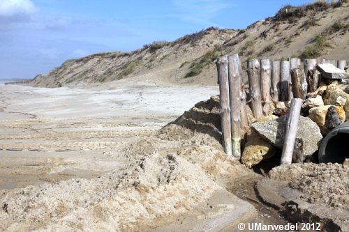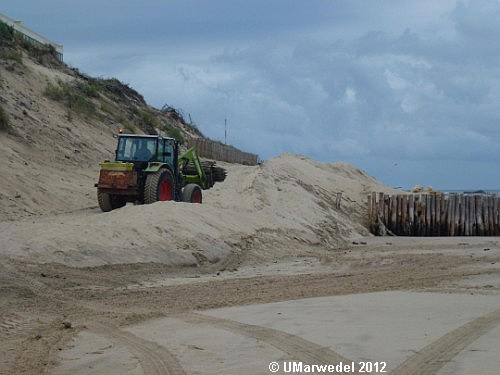 ein großer Teil des aufgeschütteten Sandes weggespült worden ist.