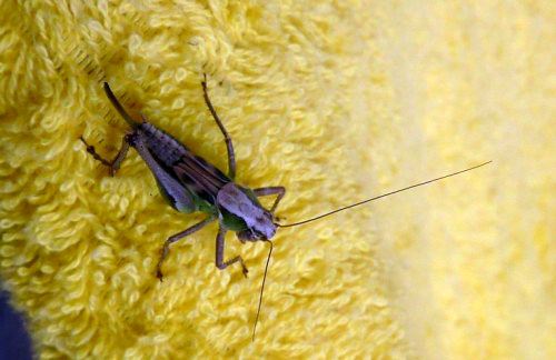 Heuschrecke, die partout vor gelbem Hintergrund auf die Platte wollte.