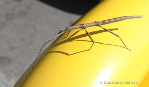 Eine Stabheuschrecke, die bei Tage unterwegs war, obwohl sie eigentlich erst in der Dämmerung und nachts auf Nahrungssuche geht. Sie hat sechs Beine, kann aber nicht fliegen. Der sehr kleine Kopf ist links kurz vor den beiden ersten Beinen.