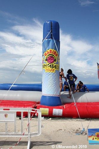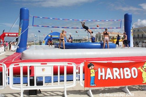 Kernstück hier ist ein sportliches Unternehmen, das als Kreuzung zwischen Trampolin und Beachball einherkommt. Die Regeln für das Geschehen beiderseits des Netzes stammen offenbar aus der Gedankenwelt der antiautoritären Erziehung, wo alles erlaubt war, was irgendwann Spass machen könnte.
