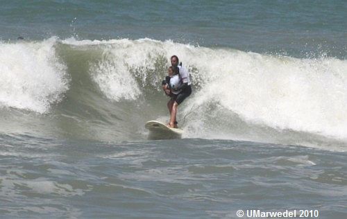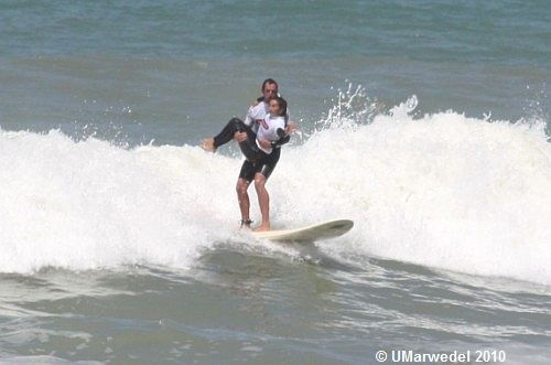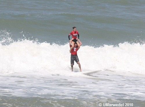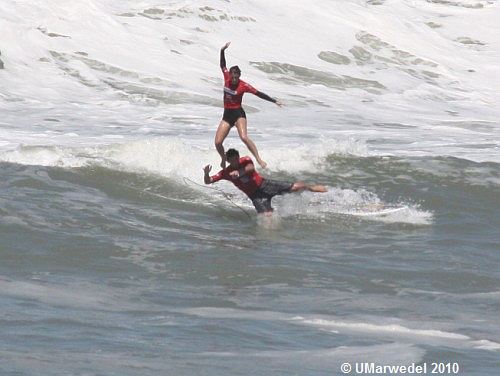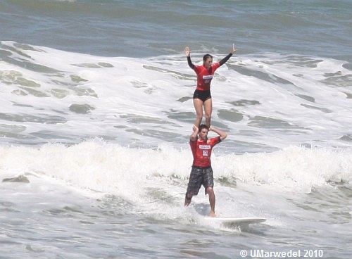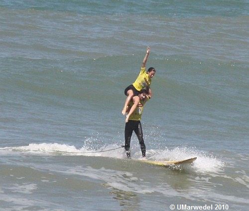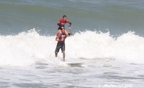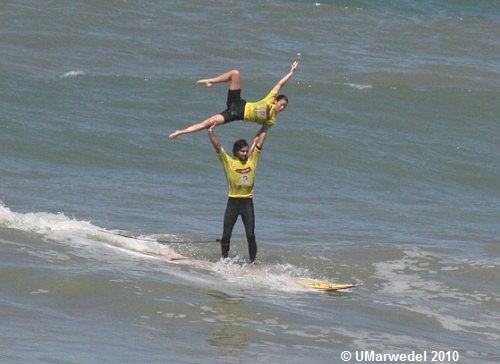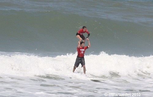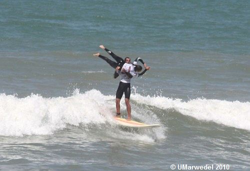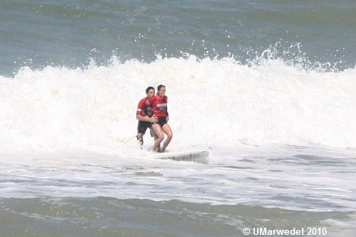 Surftandem ist eine vergleichsweise junge Sportart. Inzwischen gibt es schon Welt- und Europameisterschaften. In Montalivet fand am ersten Juliwochende ein Lauf zur nationalen französischen Meisterschaft statt. Hier bereitet sich etwas vor.