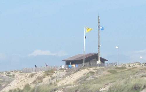 Die Strandaufsicht zeigt eine gelbe Fahne, die zu besonderer Vorsicht im Wasser mahnt.