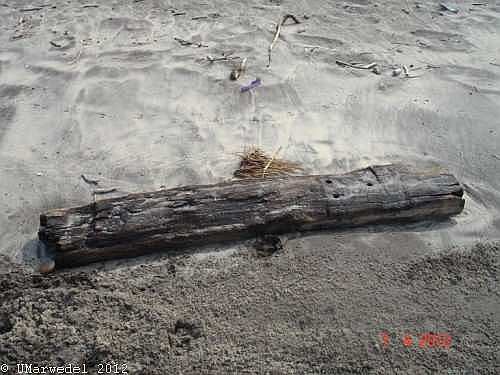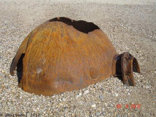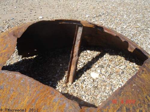 Ein von weitem geheimisvolles Gebilde, das sich bei näherem Hinsehen als Überrest einer großen Boje entpuppt. Auf dem im Bild rechts zu sehenden runden Flansch war der Mast befestigt, der das Seezeichen trug, mit dem die Boje ihre Hinweise an die Schiffahrt gab.