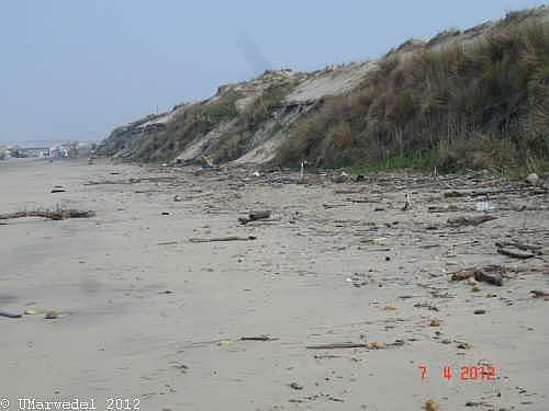 Annäherung an den Strand von Le Gurp von Süden her. Strand- und Treibgut am Fuß der Dünen.