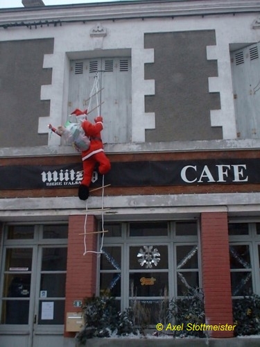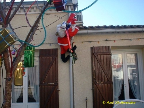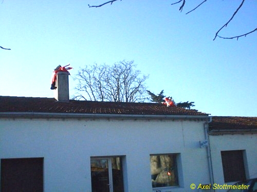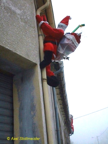 Transportverpflichtungen bestehen für einen Weihnachtsmann nicht nur horizontal, sondern auch vertikal: Bevorzugter Einstiegsweg auch französischer Weihnachtsmänner ist der Schornstein, und der ist oben auf dem Dach.