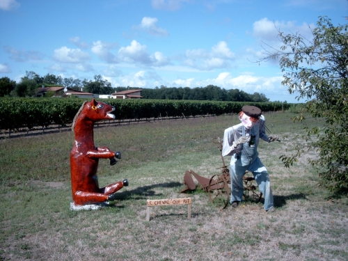 Derweil erreignet sich auf dem Feld Verwunderliches. Hier ist es nicht die hinlänglich bekannte vache qui rit, sondern ein Pferd, das lacht. Warum es lacht, ist auf dem Bild nicht gut zu sehen: Grund ist die Meinung des Bauern, er könne den Pflug besser ziehen als sein Pferd. Soll er doch, dem Pferd gefällt das sichtlich.