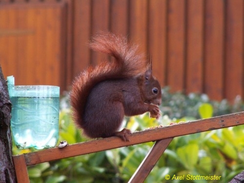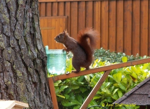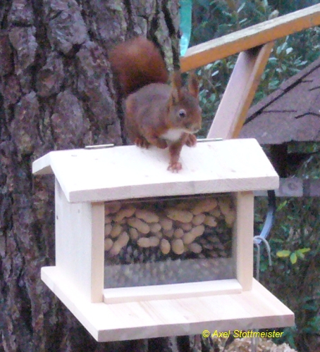 Hier weiss man nicht, ob man sich mehr über das tischlerisch-handwerkliche Geschick des Erbauers dieses Futterhäuschens freuen soll, oder ob man es bedenklich finden muss, dass ein Eichhörnchen sich so einfach dazu verführen lässt, dieses Futterhäuschen anzunehmen. Andererseits würde man sagen, dass ein Eichhörnchen, das um ein solches Futterangebot einen Bogen macht, nicht ganz richtig organisiert ist. Wir entscheiden uns für ein vermittelndes Angebot: Das Futterhäuschen ist in guter Handwerkertradition erstellt und das Eichhörnchen ist auch nicht blöd.