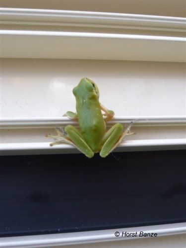 Ein schlanker Laubfrosch, Verwandter unseres Teammitgliedes Fred. Beeindruckend die Kletterfähigkeiten dieser Tiere, die wirklich die Wände hochgehen können, auch wenn sie aus Glas bestehen. Manchmal sehr mitteilungswillig, wenn Artgenossen zu hören sind. Stimmlich aber keine Entdeckung.