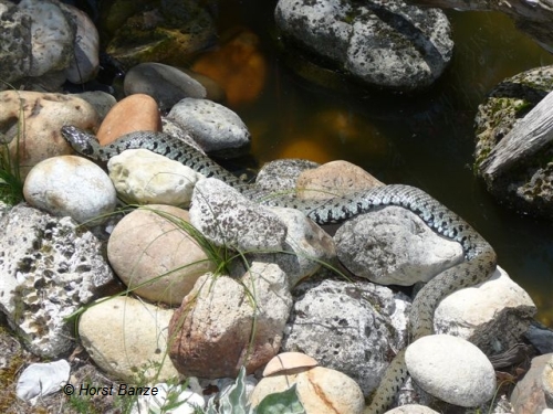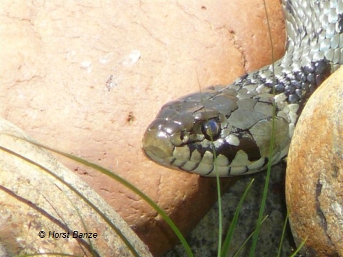 Auf den ersten Blick zu erkennen: eine Schlange. Dann wird es jedoch schwierig bei der Bestimmung der Art. Es handelt sich wohl um eine Ringelnatter, auch wenn sie sich farblich nicht ganz an die Gepflogenheiten ihrer Verwandten hält.