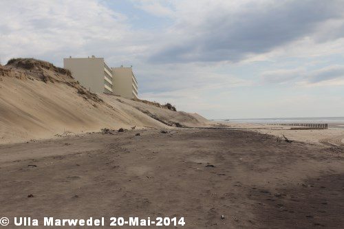Der Blick auf das Appartementhaus Le Signal zeigt, dass die Dünenkante näher an das Haus gerückt ist. Man sieht aber auch, dass der Steilküstencharakter der Dünenkante verschwunden ist und dass für einen normalen Strandbetrieb hier alle Möglichkeiten vorhanden sind.