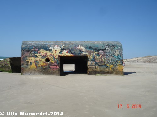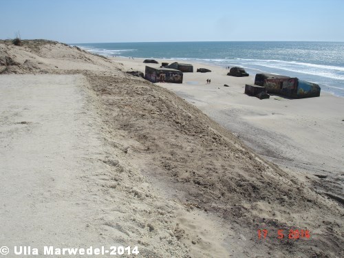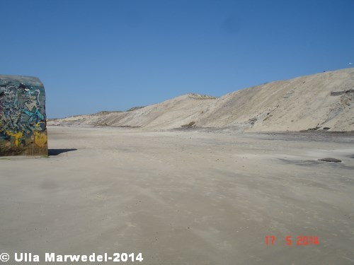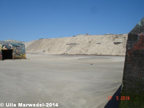 Blick über die Bunker zur Dünenkante. Oben der Container der Strandaufsicht.