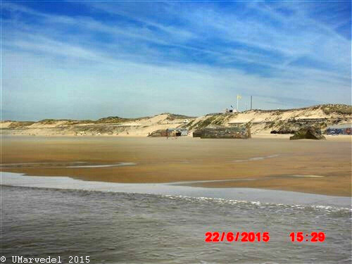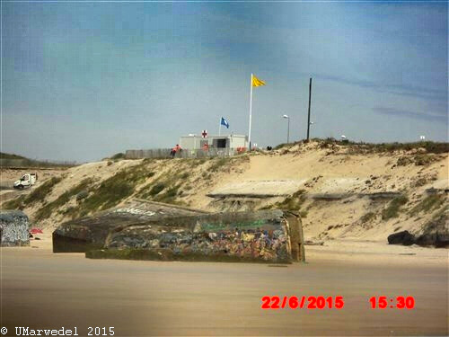 Immer noch tiefe Ebbe, am rechten Bildrand Teile der Bunkergruppe vor Le Gurp