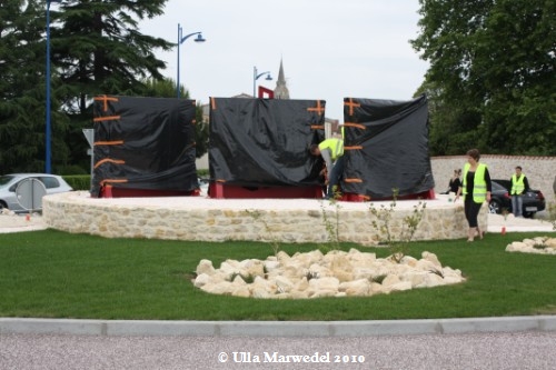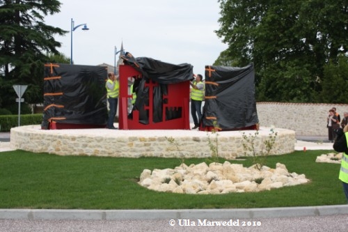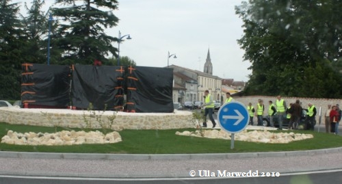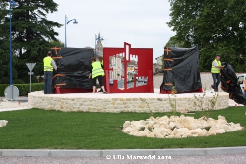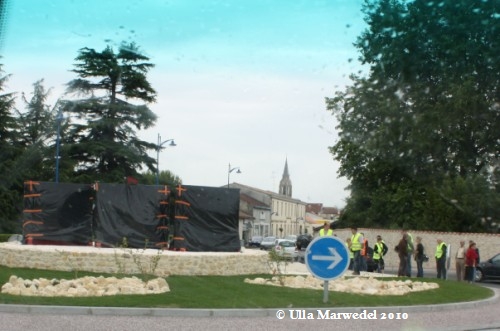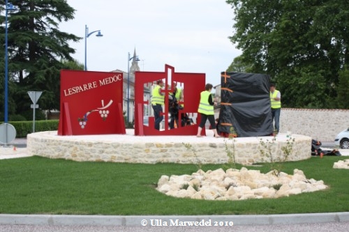 Dienstag, 15. Juni 2010, 11.59h. Ort: Kreisverkehr Saint-Léonard in Lesparre. Geheimnisvoll Verpacktes in der Mitte des Kreisels. Anwesende: Honoratioren der Stadt Lesparre, Presse und, natürlich, aber das wissen Sie ja, sonst gäbe es diese Bilder nicht.