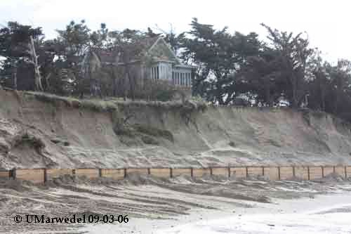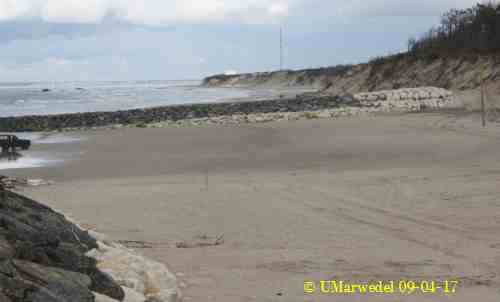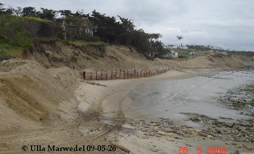 Das am meisten bedrohte Haus hat einen ersten Schutzwall am Fuß der Düne erhalten. Die Bohlenwand wird von massiven Eisenträgern gehalten. Hinter den Bohlen sind Betonbruchstücke und Sand aufgefüllt.