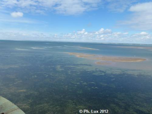 Und schließlich eine Aufnahme von der Spitze des Leuchtturms aus, gemacht im Juli 2012. Inzwischen verliert die Insel an Höhe und Umfang. Die Erwartungen, an dieser Stelle eine dauerhafte neue Insel etstehen zu sehen, haben sich nicht erfüllt. So ist der hoffnungsvoll begrüßte Neuankömmling wieder zu einer normalen Sandbank geworden, und dies bevor man sich Gedanken um einen Namen machen musste.