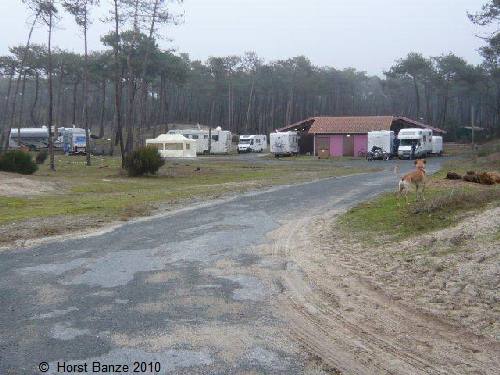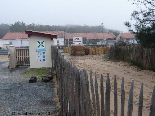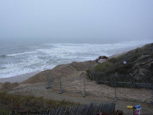 Auch der SUD OUEST ist unübersehbar von der Partie. Roccos Kommentar ist gut zu sehen. Das Bauwerk ist ein zur Sicherheit der Besucher gebauter Übergang über die Piste. Hier am Parklatz von Le Gurp, ein zweiter steht an der Pointe de la Négade.