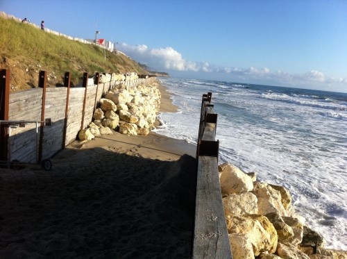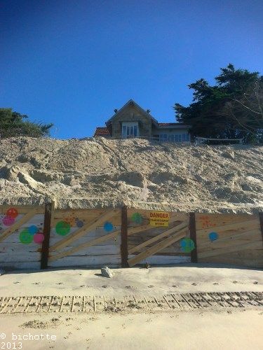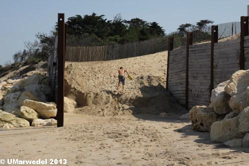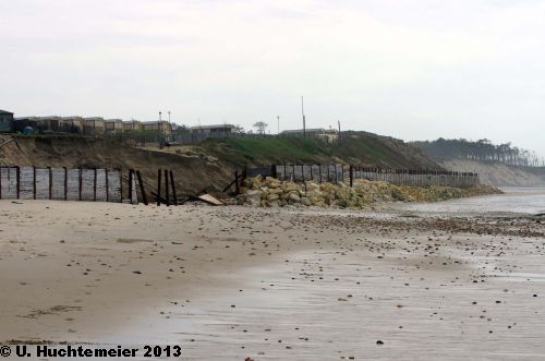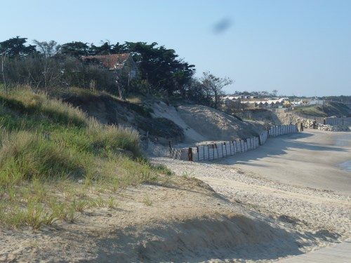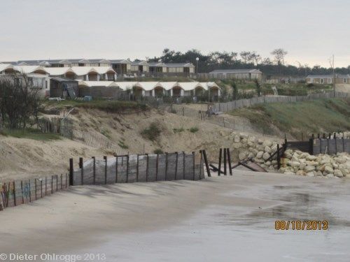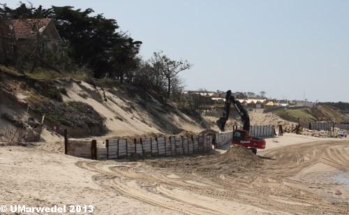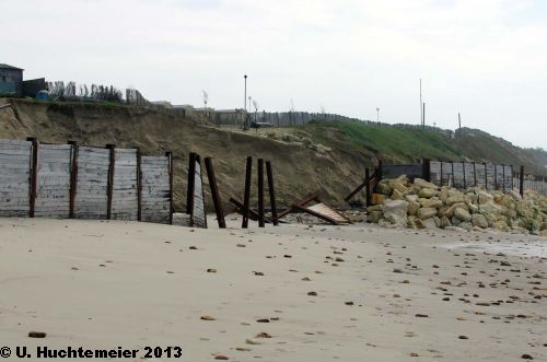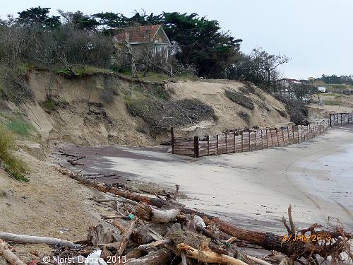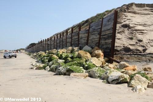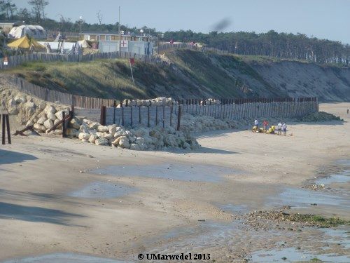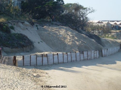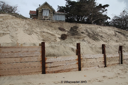 Die Schutzbauten am Fuß der Düne vor dem schon seit Jahren bedrohten Haus hinter dem enrochement haben bei den letzten hohen Fluten wieder stark gelitten.