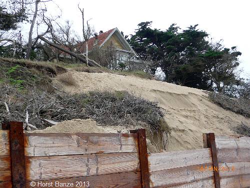 Die letzten hohen Fluten haben der sowieso schon arg ramponierten Düne vor dem bedrohten Haus weiter zugesetzt.