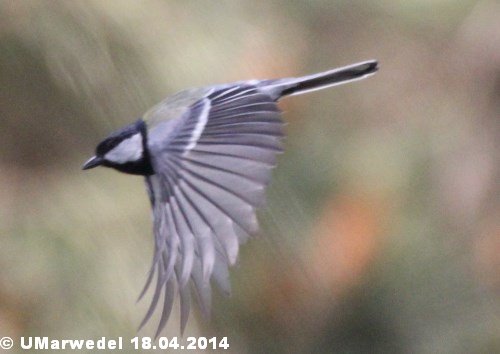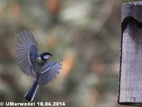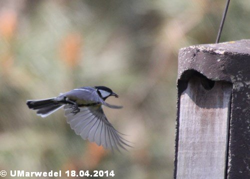 Mutter Meise ist fertig. Jetzt ist sie schon wieder auf dem Weg zur nächsten Mahlzeit für die Kleinen.