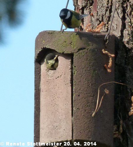 Auch Meisen müssen mal, in diesem Fall aus dem Nest in die weite Welt hinaus. Hört sich leichter an als es ist. Hier bedenkt ein Jungvogel, gut zu erkennen an dem breiten gelben Schnabel, der bei seinen Eltern einen nicht zu bremsenden Reflex zum Füttern auslöst, ob es sich lohnt, das Nest mit seinen Annehmlicheiten zu verlassen.