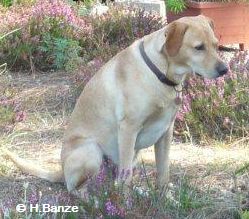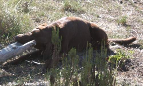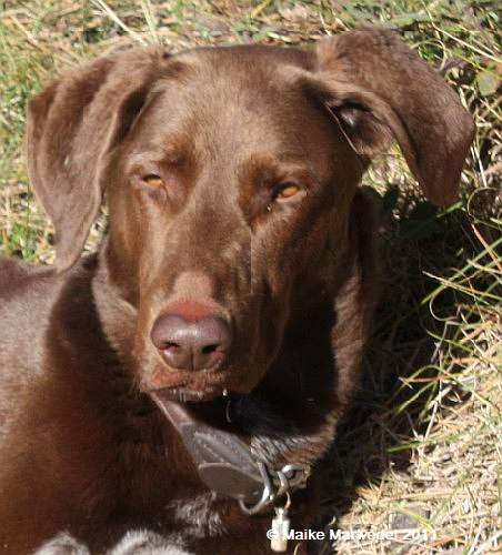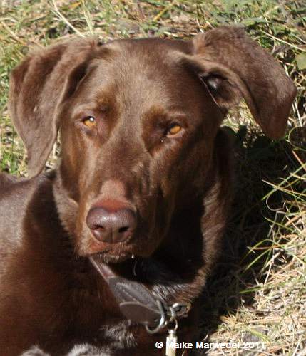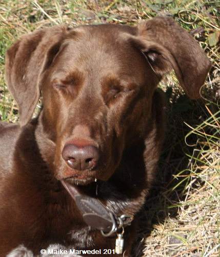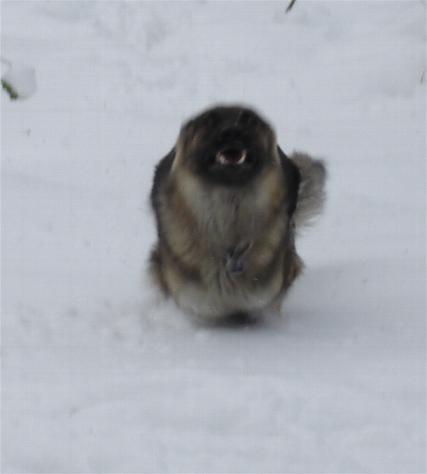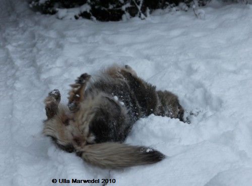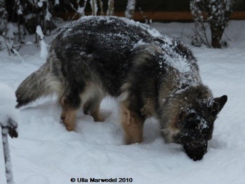 Jule hat Anspruch auf Freizeit, auch wenn sie nicht im Médoc ist. Hier testet sie im Dezember 2010 Schnee. Der Schnee auf ihrem Rücken ist übrigens ein gutes Zeichen, er zeigt, dass ihr Fell so gut isoliert, dass der Schnee nicht schmilzt.