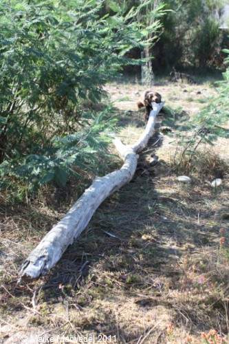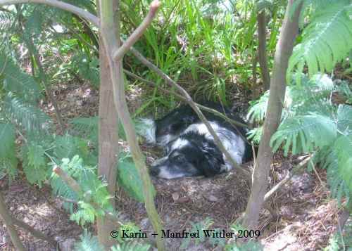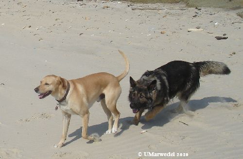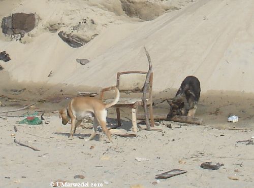 Jule und Rocco nach der Inspektion eines Strandsessels. Rocco desinteressiert, Jule mal wieder beim Krafttraining.