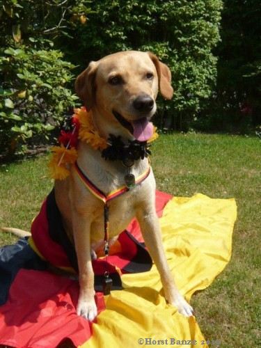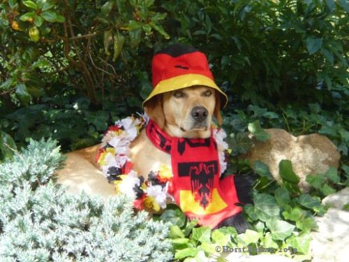 Rocco nach dem WM-Spiel der deutschen Mannschaft gegen ihre argentinischen Konkurrenten (bei der WM 2010). Es hat sich gelohnt, dass er die Pfoten gedrückt hat. Oder etwa nicht?