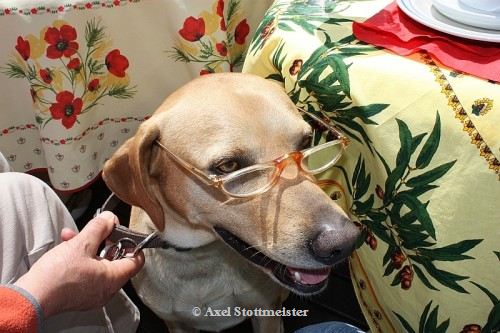 das Bild wurde von Deinem Chef völlig falsch gedeutet. Ganz im Gegenteil, ich bin weit und breit der einzige Vierbeiner. Weil ich für mein gutes Benehmen bekannt bin, werde ich rundherum verwöhnt – ich bin quasi Hahn (Hund) im Korb . Sogar bei Renate habe ich völlige Narrenfreiheit. Überall fällt für mich ‚was ab – also, von wiederverwendbarer Wurst kann keine Rede sein, ich muss nicht darben und fühle mich sauwohl. Trotzdem finde ich es lieb von Dir, dass der Dir suggerierte (falsche) Eindruck Sorgen bereitet und Du um Besserung bemüht bist – vielleicht kann ich mich ja zu gegebener Zeit revanchieren.